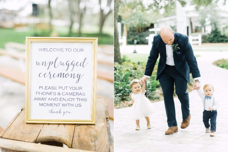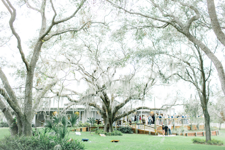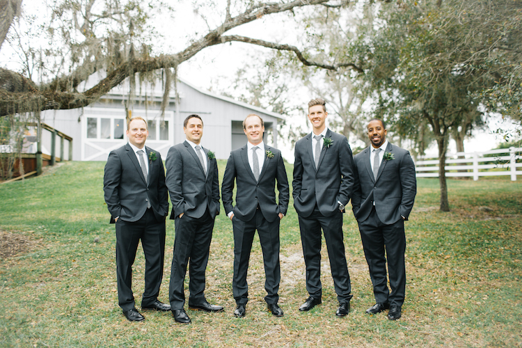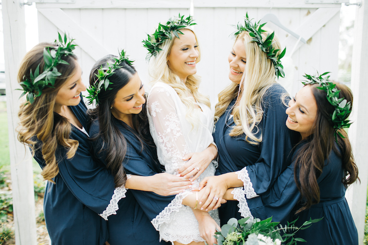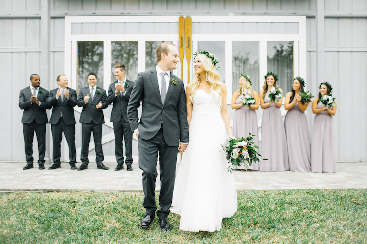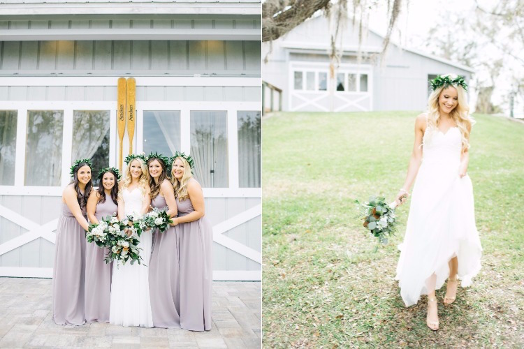 The bride and her maids wore matching crowns of greenery as they prepped for the day in the bridal suite. Ashley met Scott beneath one of the property’s impressive oak trees draped with Spanish moss for their first look. After the outdoor ceremony, guests gathered on the lawn for cocktail hour. Inside the Boathouse barn, gold place settings brought a touch of sparkle to polished farm tables and simple ivory linens. Dessert was an affair in its own right, with a spread of donuts and a sugar-dusted naked cake. Thanks to photographer, Jessi Caparella for sharing these amazing images!