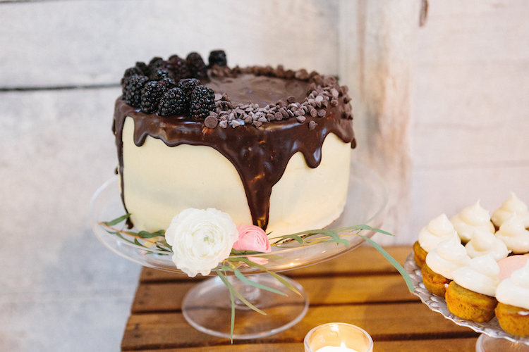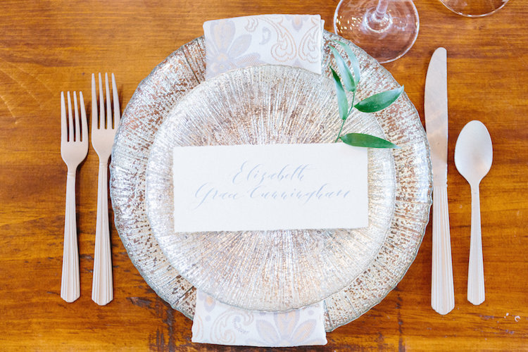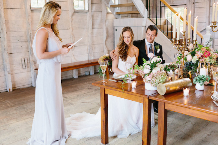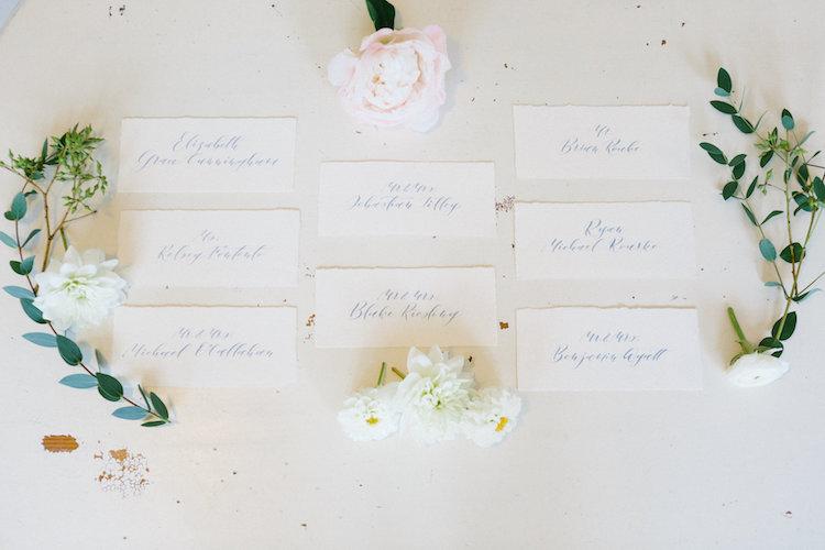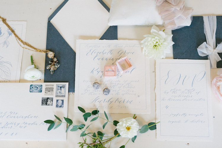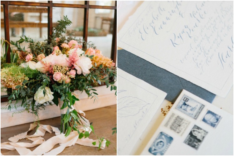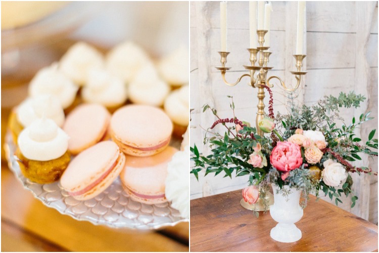 We love how the shoot’s color scheme combined muted blue, creamy blush, soft ivory, and pops of peach to create a balanced palette that complemented the landscape’s changing leaves. Mixed greenery made a statement in the bridal bouquet, reappearing on the tablescape in a lush garland. Inside the barn’s airy interior, an elaborate dessert table showcased a spread of petite cakes and treats to cap off the design with a sweet finish. Thank you to the wonderful team of vendors for sharing their work with us. Happy scrolling!