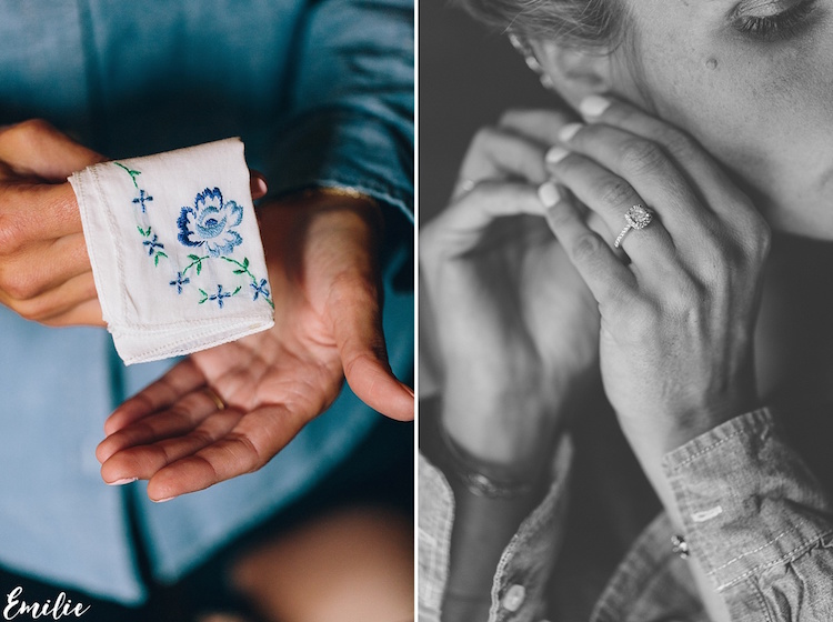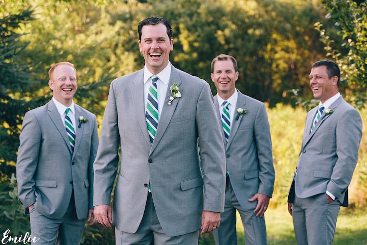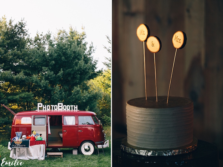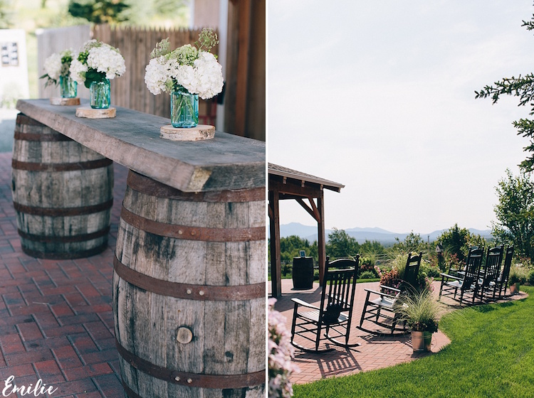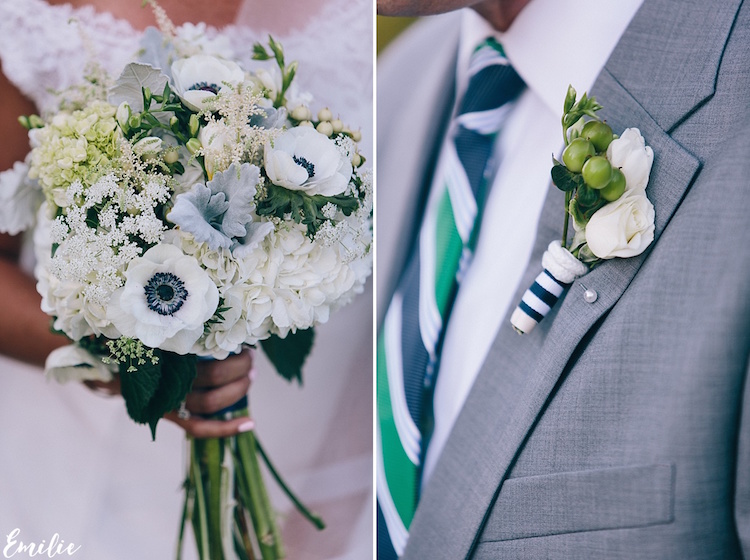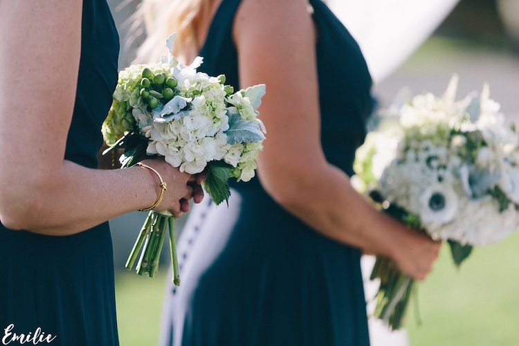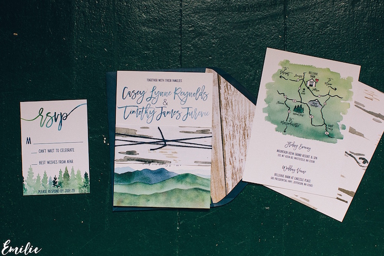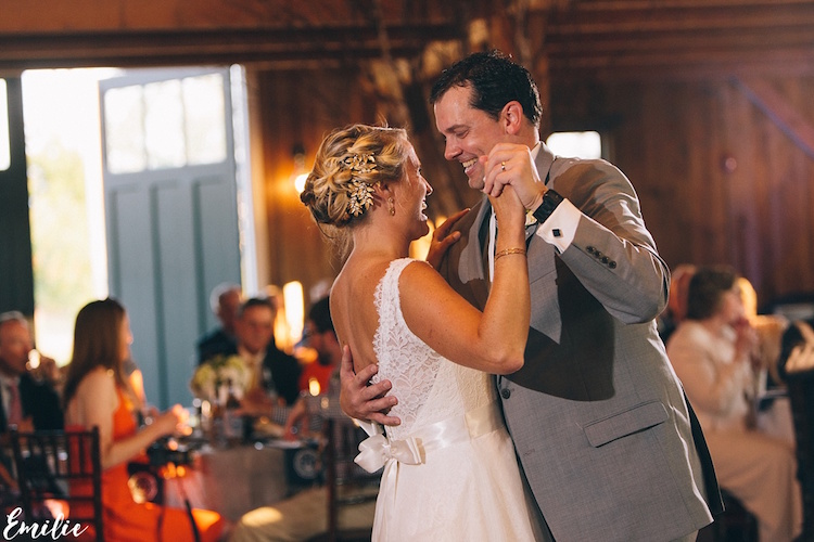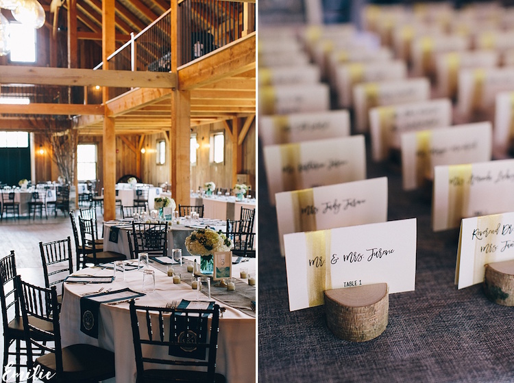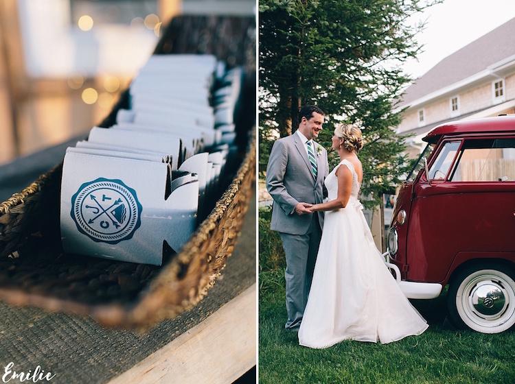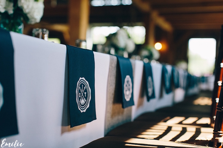 When it came to selecting their wedding venue, Casey and TJ knew they wanted a space that offered an aura of warmth and welcome. They took inspiration from summers spent at the bride’s family lake house, to create an intimate “camp” feel with personal design details. A timeless color palette of navy, grey, ivory and green complimented the barn’s timber interior. We love how Casey and TJ incorporated their custom wedding logo throughout the day– you’ll see their “family crest” pop up on the ceremony programs, beverage koozies and reception place settings!