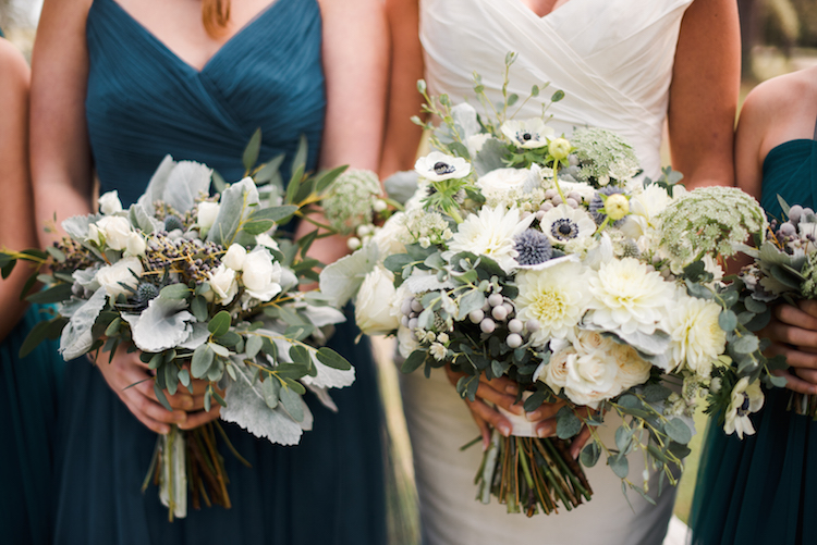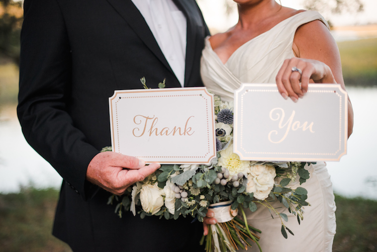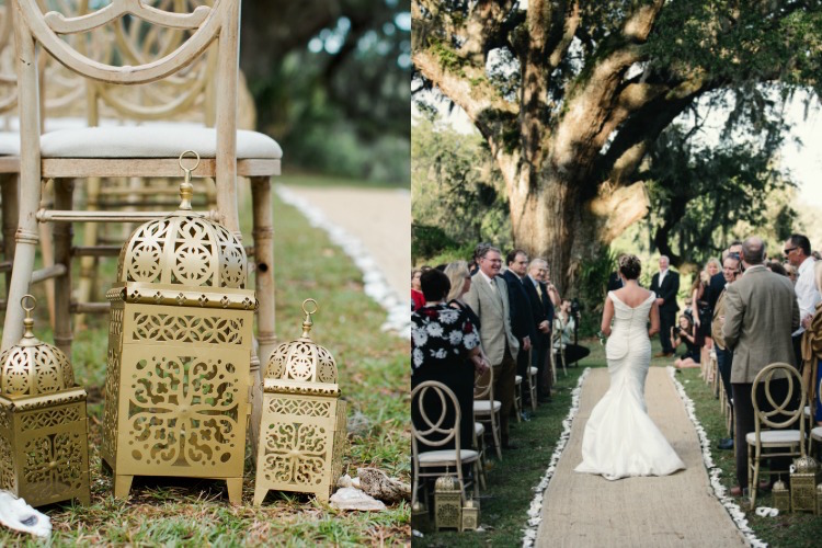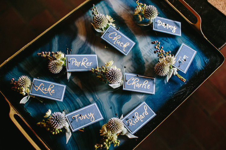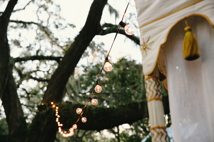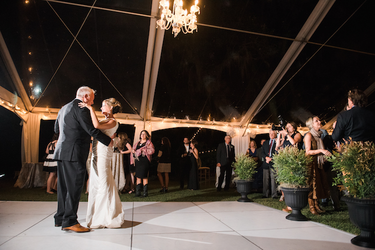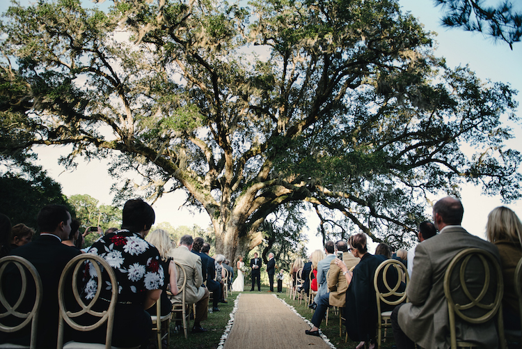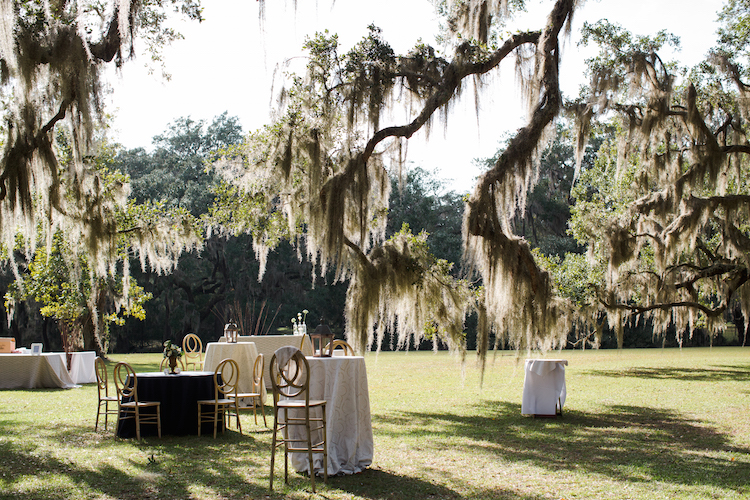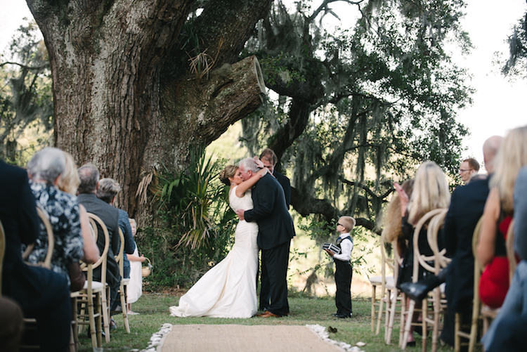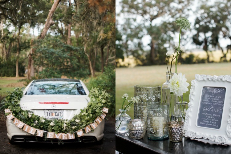 Everything about this wedding tugs at our heartstrings, from the family’s inclusion in the bridal party, right down to the newlywed getaway car festooned with pennants and greenery. Catherine and Tony said, “I do!” on the property’s lawn beneath the shade of an ancient tree. The party continued to an open air cocktail lounge where Spanish moss and sparkling chandeliers hung overhead. Inside the tent, we love how elegant arrangements, gold accents and navy linens continued the day’s refined, yet rustic theme. Thank you to The Scobeys for sharing these gorgeous images with us!