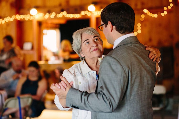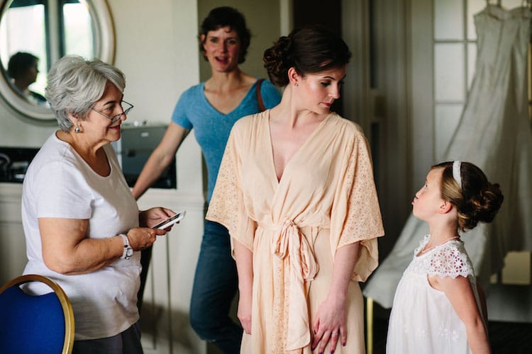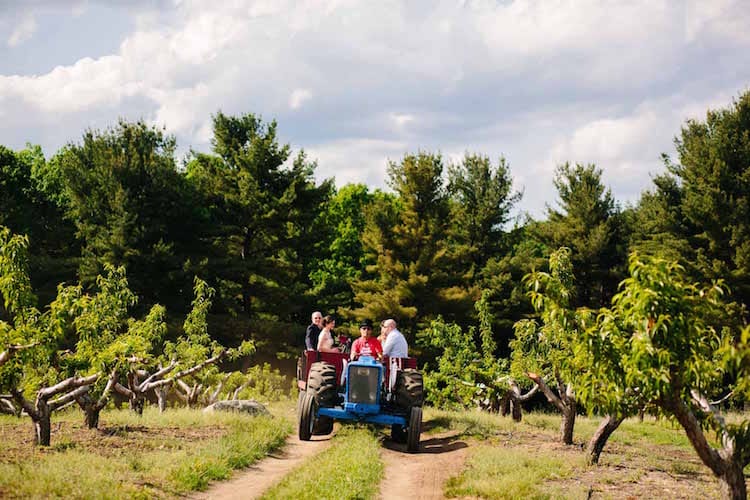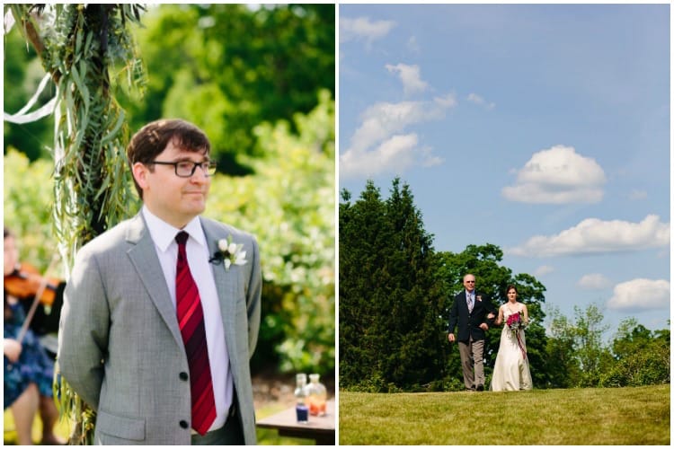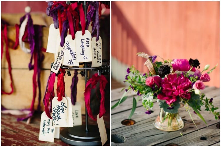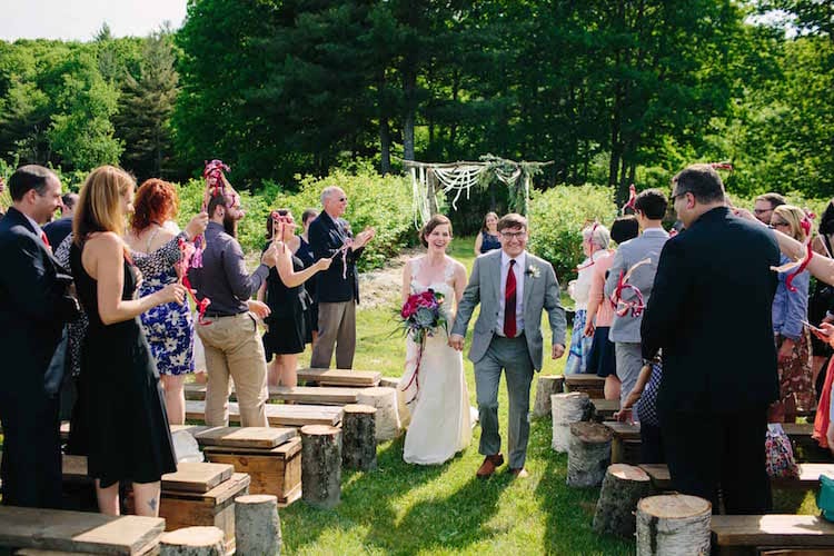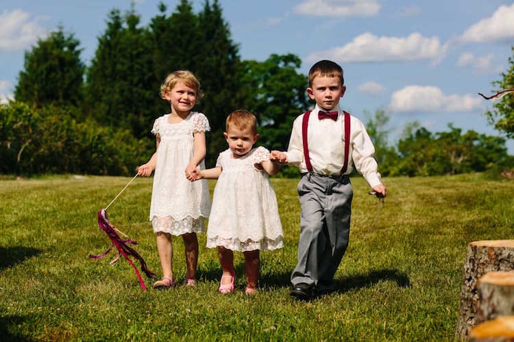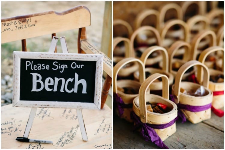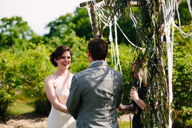 Guests gathered in a sun-dappled clearing surrounded by blueberry bushes and apple trees for the ceremony. Emily and her family arrived in a tractor-drawn wagon, where Matt waited by a simple wooden ceremony arch framed by pristine skies. After the “I do’s!” the party returned to the lawn where Emily surprised her groom with a vintage VW selfie booth, just like the family van from his childhood. The design continued with heartfelt touches like a “guest book” bench, silk ribbon escort tags and a performance by the Somerville Symphony Orchestra featuring Matt on the drums. Thank you to Kelly Benvenuto for the amazing photos!