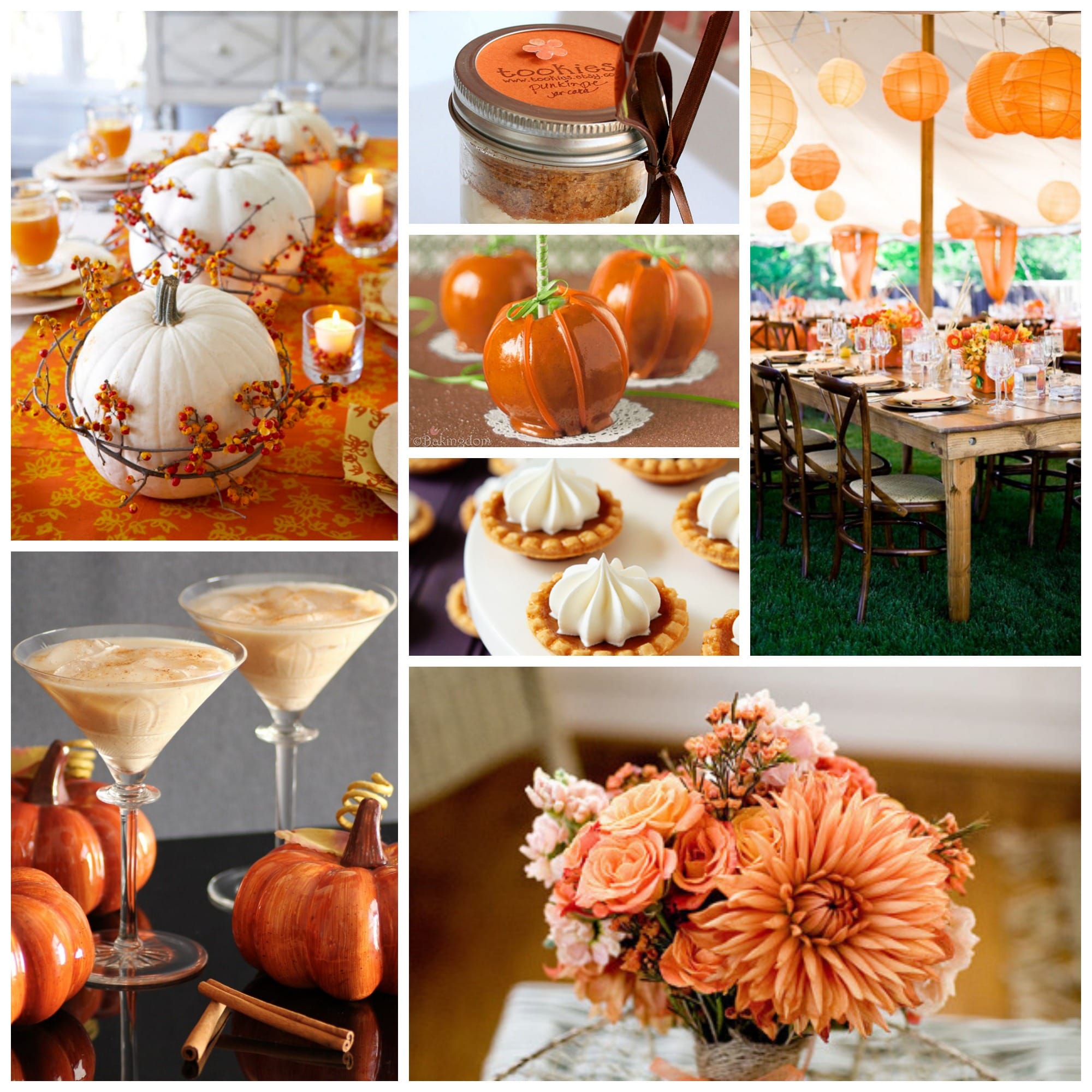Photos: Martinis by Noshing with the Nolands, Pumpkin Centerpieces by Michael Partenio via Your Cozy Home, Pumpkin Cake by Tookies via Brides, Candied Apple Pumpkins by Bakingdom via Brenda’s Wedding Blog, Mini Pumpkin Pies by My Baking Addiction, Reception Set Up by Luna Bazaar via Rustic Wedding Chic, Bouquet by Kellie Kano via Style Me Pretty