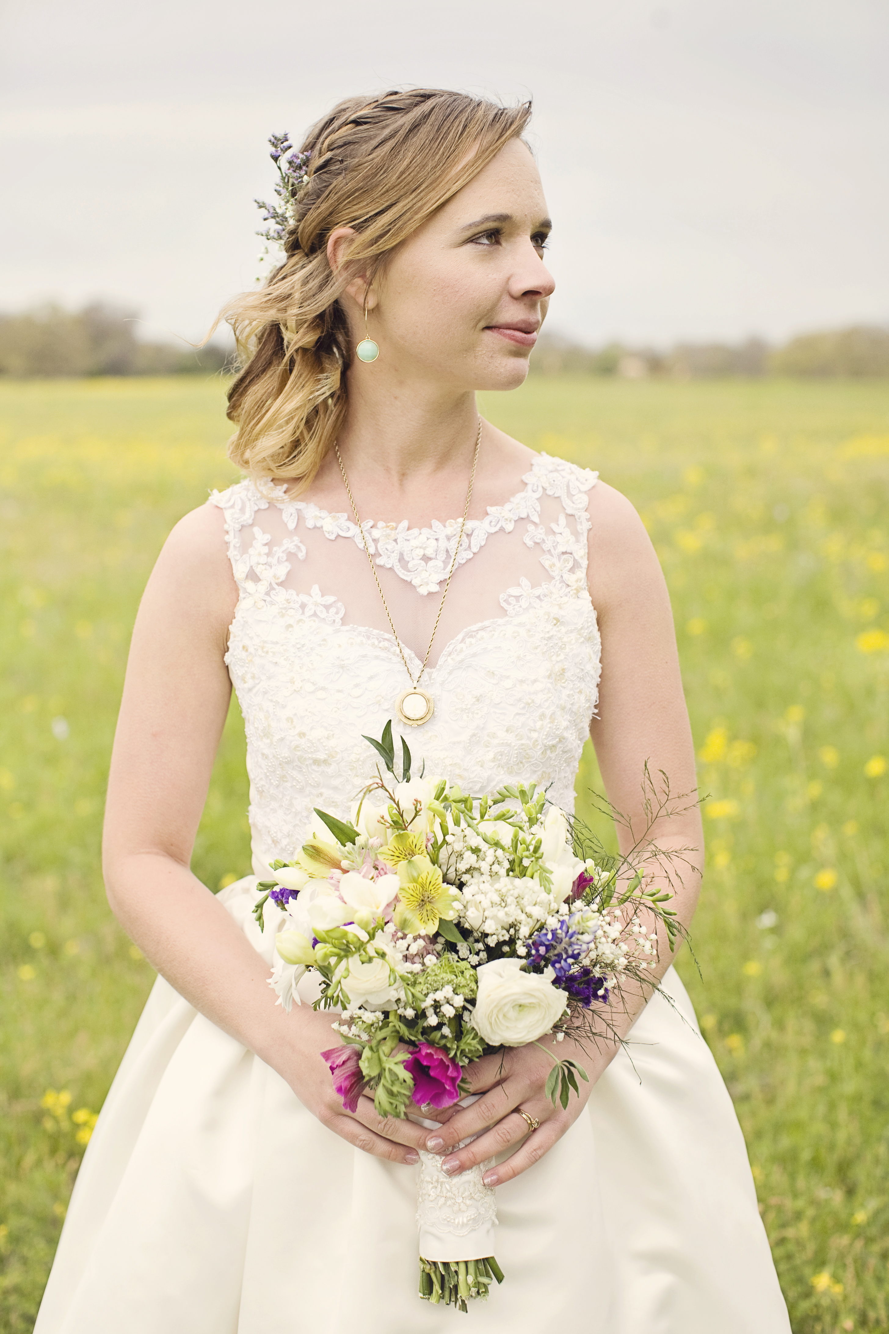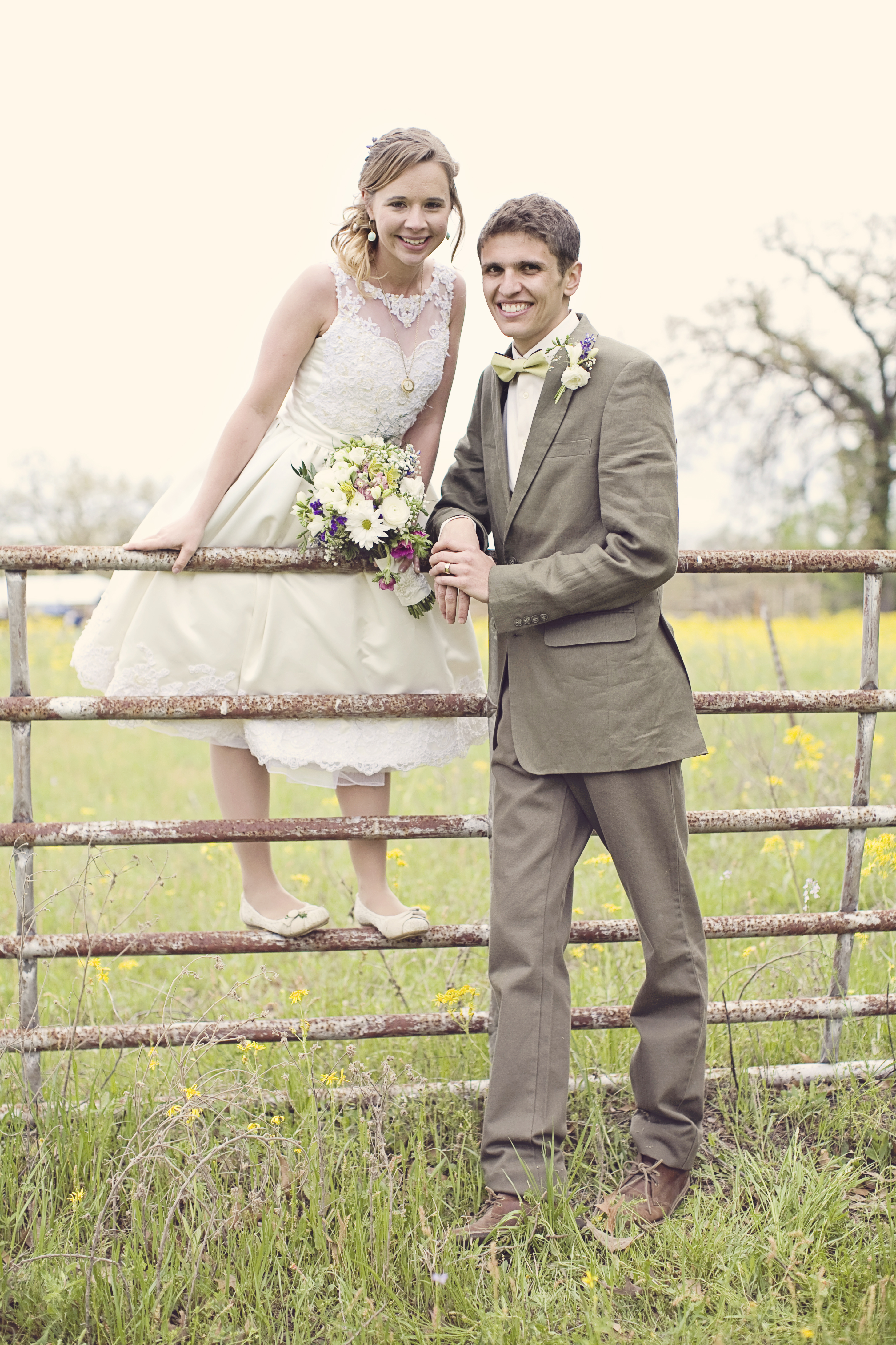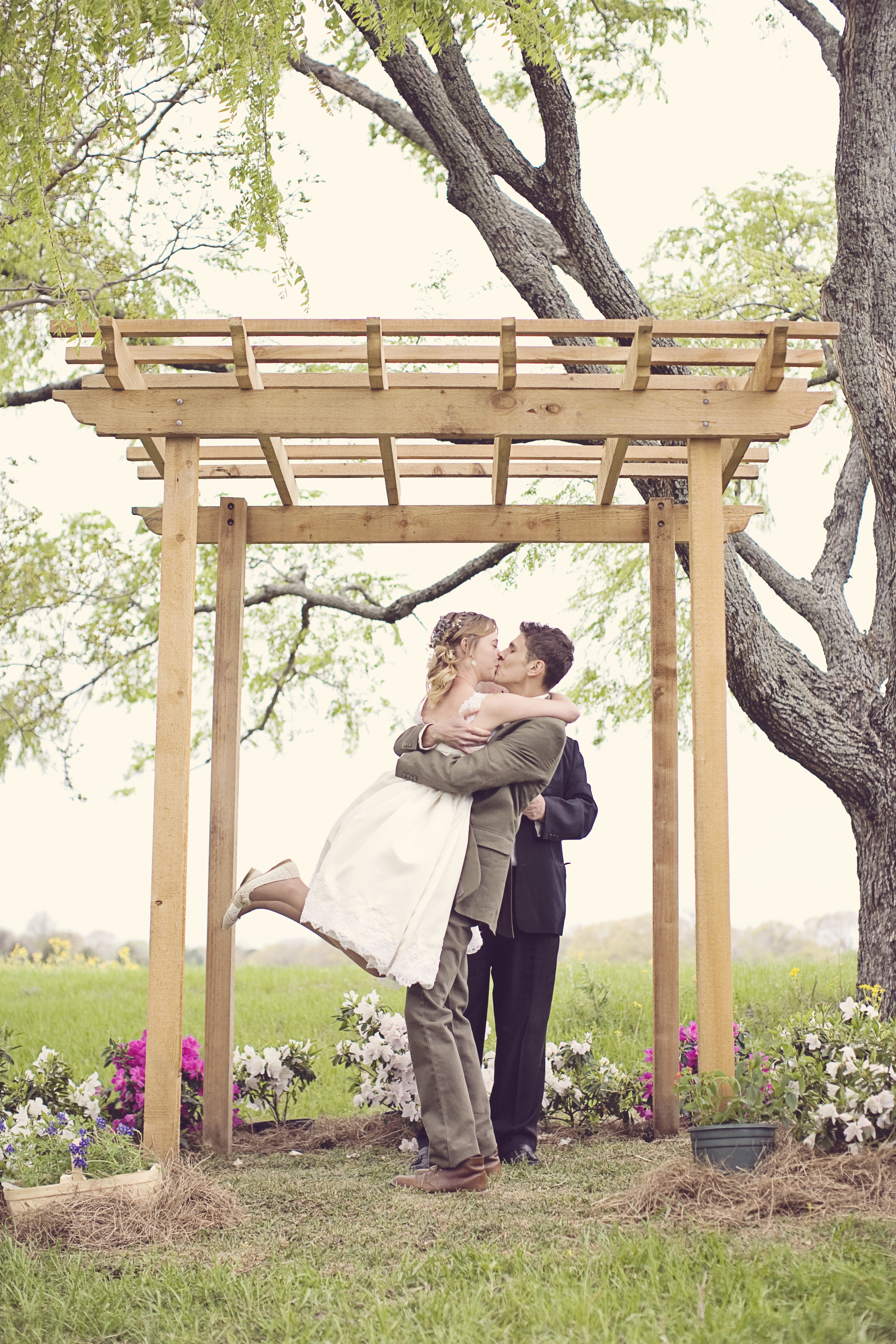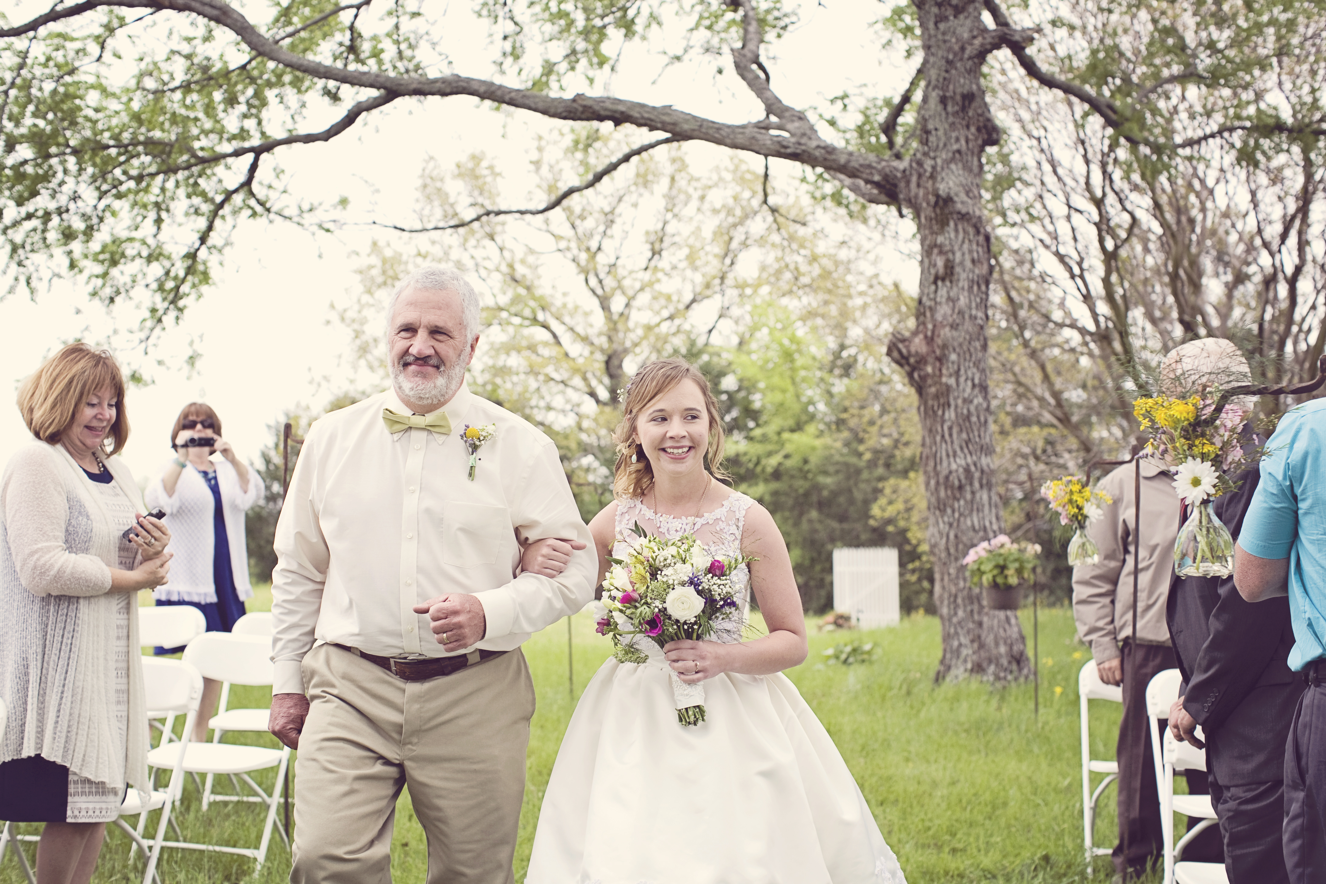 Immediately after the proposal, Tiffanie’s parents began to plant bluebonnets and wildflowers around the wedding site. Unfortunately, these flowers came up in only a limited quantity. But then, a few days before the wedding, the fields burst into a brilliant yellow of unplanted wildflowers! The transformation of the hay fields into a burst of color was so beautiful and seemed incredibly miraculous. Special things of the wedding included Tiffanie’s gown, which was hand-made by her mom, hand-painted signage, bride and groom manikins at the gate, open-air dining, mason jar pies, real silverware wrapped in homespun napkins, hay rides, and outdoor games like kite flying, horseshoes, croquet, and a beanbag toss.