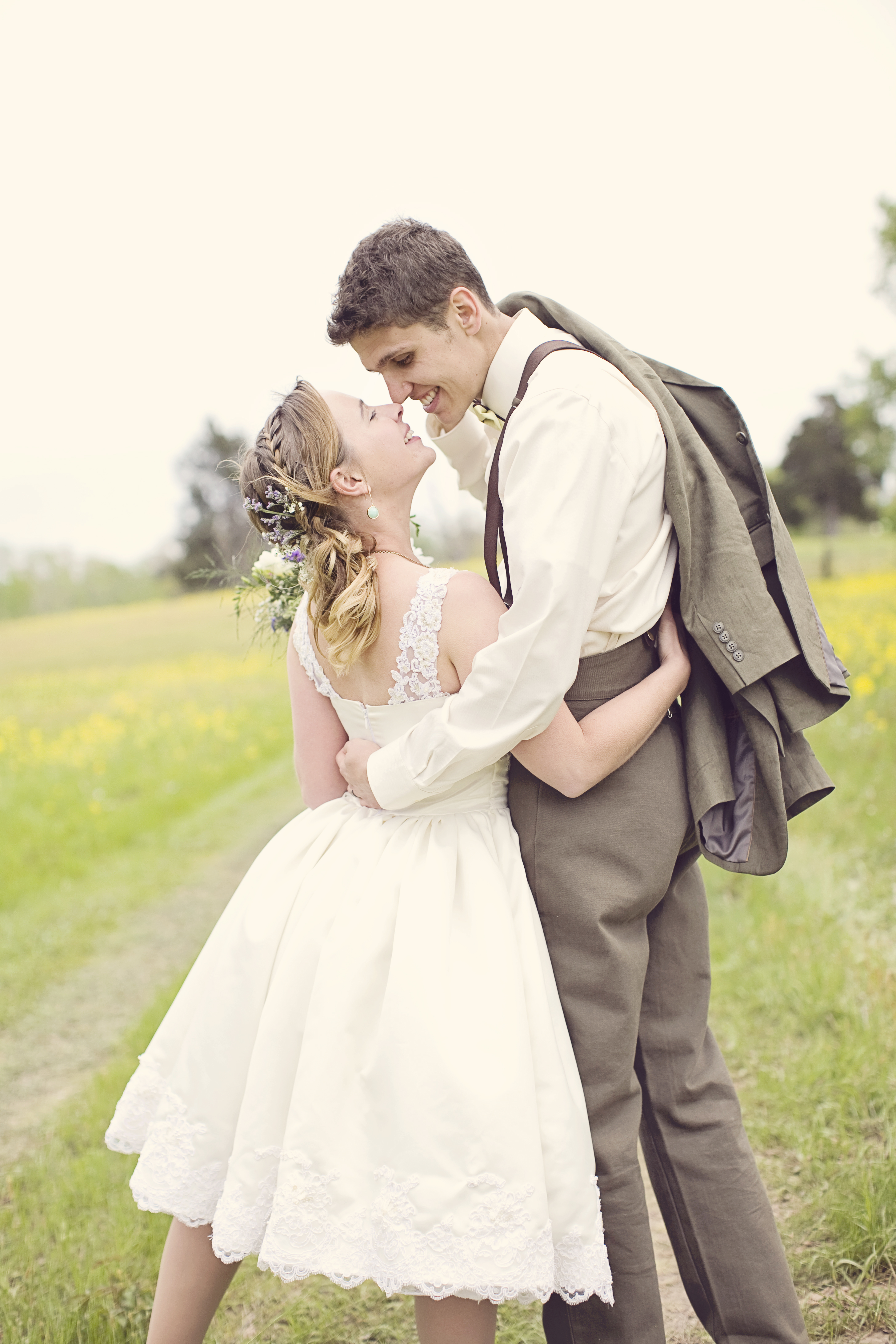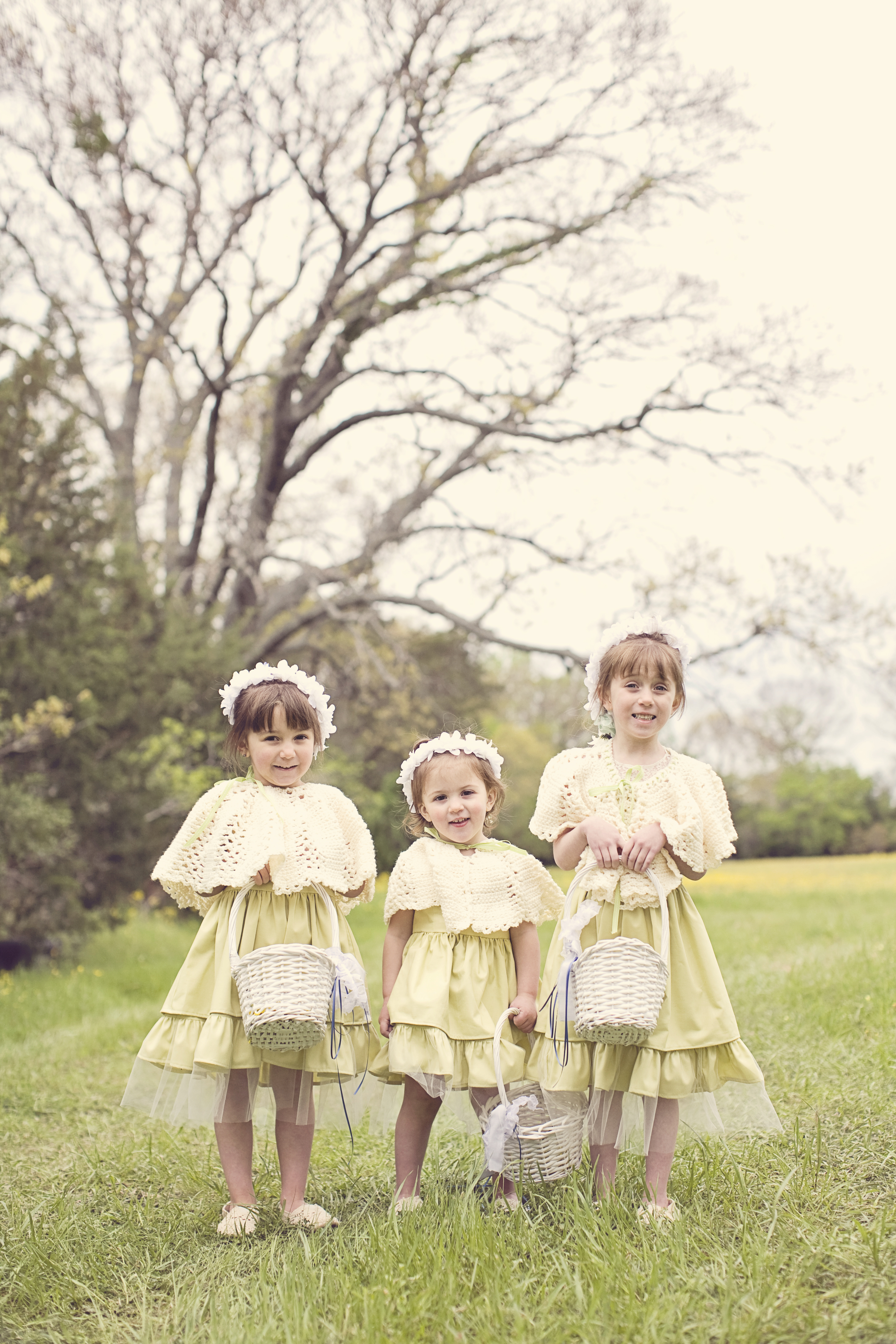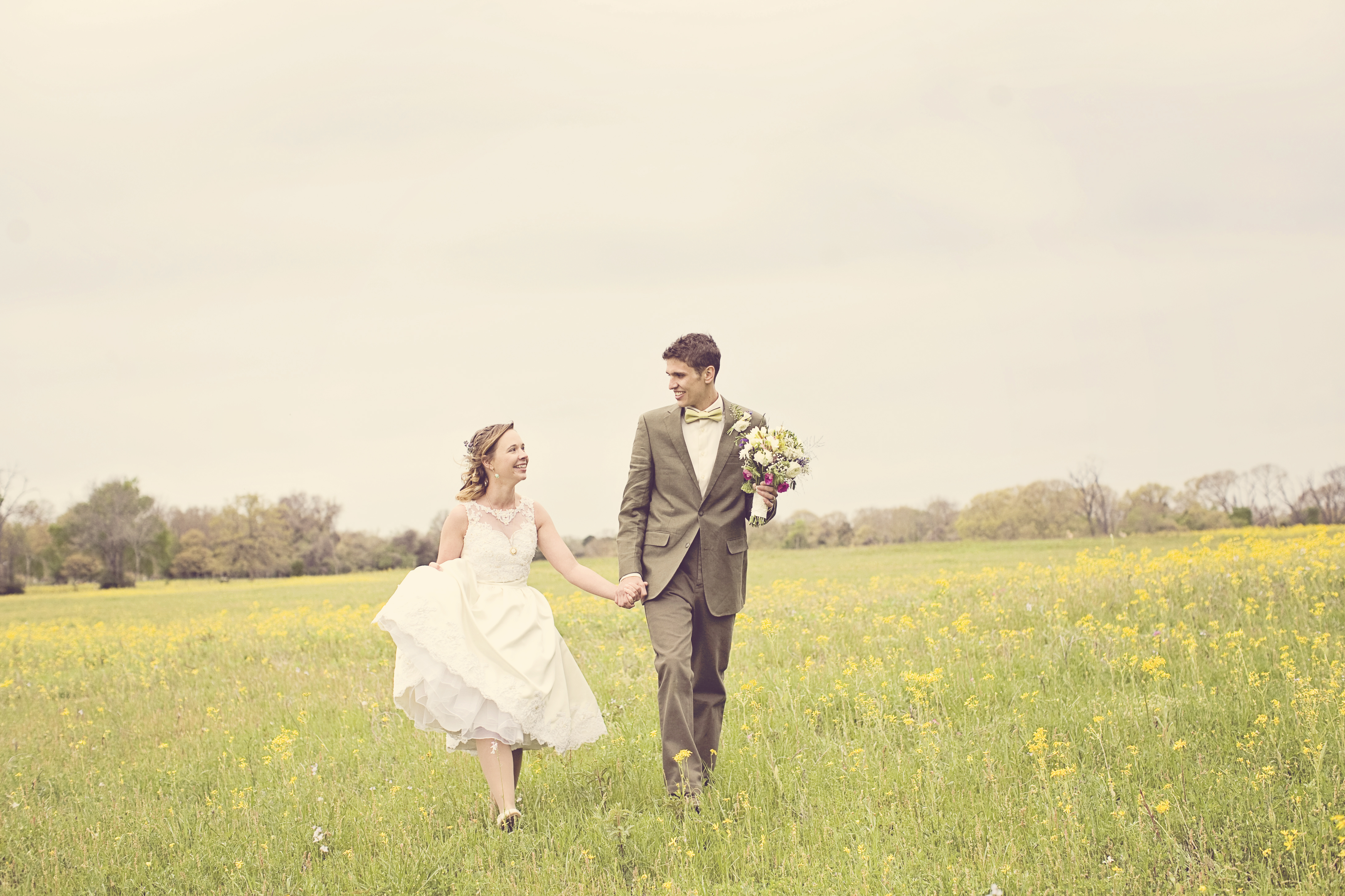 Immediately after the proposal, Tiffanie’s parents began to plant bluebonnets and wildflowers around the wedding site. Unfortunately, these flowers came up in only a limited quantity. But then, a few days before the wedding, the fields burst into a brilliant yellow of unplanted wildflowers! The transformation of the hay fields into a burst of color was so beautiful and seemed incredibly miraculous. Special things of the wedding included Tiffanie’s gown, which was hand-made by her mom, hand-painted signage, bride and groom manikins at the gate, open-air dining, mason jar pies, real silverware wrapped in homespun napkins, hay rides, and outdoor games like kite flying, horseshoes, croquet, and a beanbag toss.