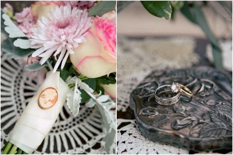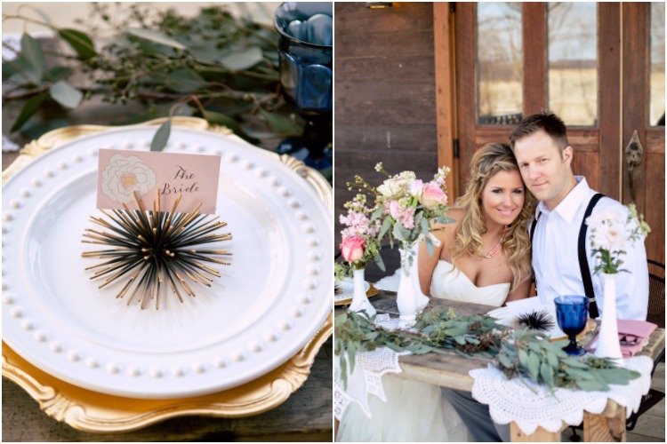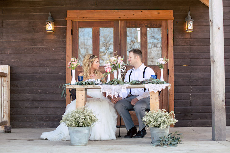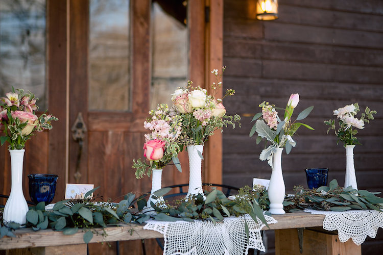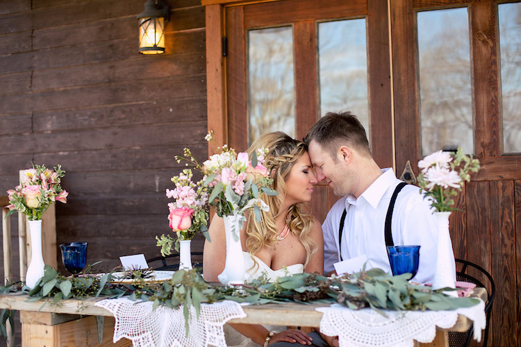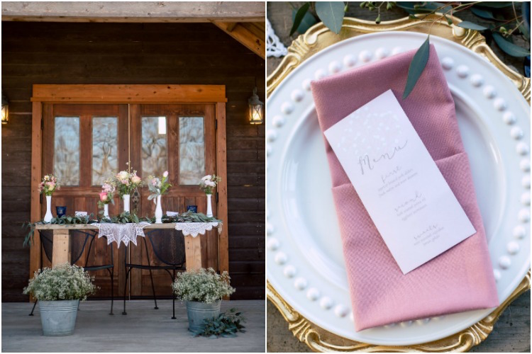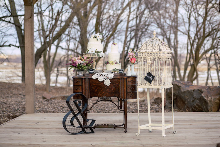 Mismatched antique pieces and dreamy shades of rose, peach and cream come together perfectly to craft an aura of rustic romance. Repurposed farmhouse doors and vintage frames make a unique ceremony backdrop on the property’s lawn. At the reception table you’ll fall in love with the pretty in pink paper goods, vintage lace and gold-rimmed place settings. When it comes to the cake table, sign us up for dessert! We love how the team incorporated more antique finds to present these irresistible confections.