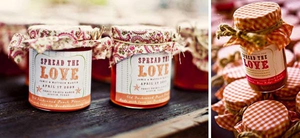 Another fun favor is a small personalized jar of jam or apple butter so guests can “spread the love” on their toast at home. You can have the labels for the jars printed with your names and wedding date for a keepsake, or personalize the jars with guests’ names for place settings.